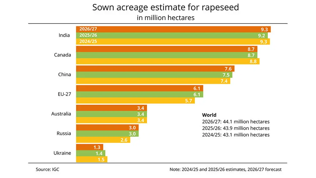 The global rapeseed planted area is expected to total 44.1M ha in 2026/27, a modest increase of 0.2M ha on the previous season, according to International Grains Council (IGC) estimates reported by Germany’s Union for the Promotion of Plants and Protein (UFOP).
