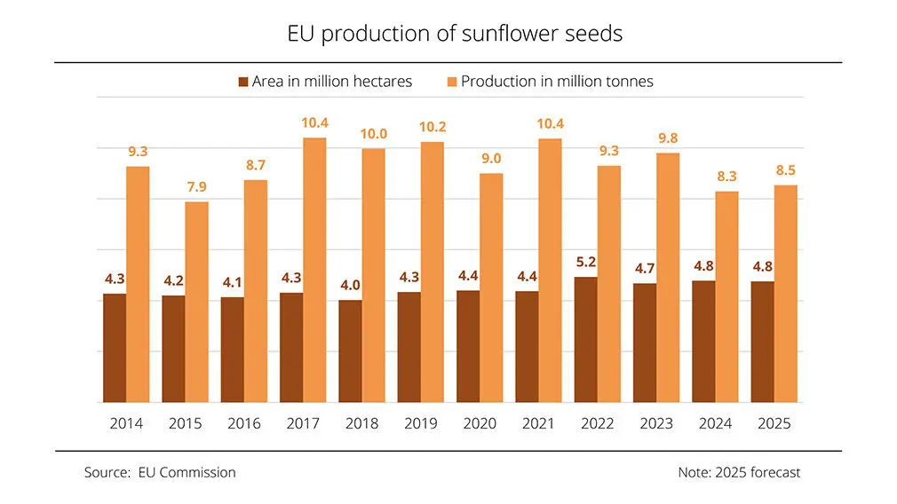 EU sunflowerseed production in 2025 is expected to total just over 8.5M tonnes, a 3% increase on the previous year’s harvest.